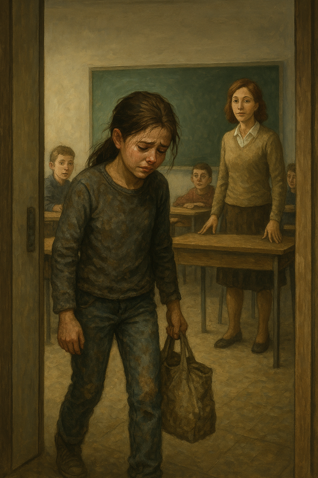 ორშაბათი. შემოდგომისფერი დილა იყო... ქარი ცეკვებოდა ხეეებს და აცლიდა გამხმარ, გაყვითლებულ ფოთლებს... ელენე სკოლის გზას მიუყვებოდა, ხანდახან დასვრილ ფეხსაცმელს უყურებდა, უნდადა გაეწმინდა რამით, მაგრამ ამის დრო არიყო! ხელში ძველ ჩანთას მძლივს იჭერდა, აი, ის კი სუფთა იყო! ყოველ ბაბიჟთან ერთად უფრო და უფრო გრძნობდა შიშს, რომ დააგვიანდებოდა. გაკვეთილის დაწყების ზარი უკვე გაისმა. ელენე კარის წინ შეჩერდა, ამოისუნთქა და ფრთხილად შეაღო. კლასში მყოფმა მოსწავლეებმა ერთიანად მიაპყრეს მზეერა. ტალახიანი ფეხსაცმელი, დასვრილი ჯინსი და არეულად შეკრული თმა ყველას თვალში მოხვდა. რამდენიმე ბავშვმა ჩუმად, მაგრამ მაინც გასაგონი ხითხითი დაიწყო. — „ტანსაცმელი ყოველდღე უნდა გამოვიცვალოთ“— გაისმა უკანა მერხიდან. — „ნახე რამხელა ლაქები აქვს, ალბად, დედა არურეცხავს „— დაამატა სხვამ. ელენეს ისედაც ცრემლით სავსე ჰქონდა თვალები, უბრალოდ ცდილობდა თავი დაბლა დაეხარა, რომ არავის დაენახა მისი შეშუპებული და ცრემლიანი სახე, თითქოს საუკუნე მოუნდა ბოლო მერხთან მისვლას... თანაკლასელების სიცილის ხმა კი გულსა და სხეულს უწვავდა. სწორედ მაშინ აუღელვებლად, მაგრამ მტკიცე ტონით გაისმა მერი მასწავლებლის ხმა: — საკმარისია! — თქვა მკაცრად. — არავის აქვს უფლება სხვას დასცინოს, ამს გასწავლით?! ასე, გიყვართ თქვენი თანაკლასელი ?! კლასი დადუმდა. მერი მასწავლებელი ელენეს მიუახლოვდა და ნაძალადევი ღიმილით ჩურჩულით ჰკითხა: — ელენე, რა მოხდა? რამე გტკივა? ელენეს მამა გარდაცვლილი ჰყავდა, მისი პაპა-ბებია ძალიან შორს მთაში ცხოვრობდნენ, მას მხოლოდ დედას ზრდიდა. მასწავლებლის თბილმა მზერამ თითქოს ჩამოანგრია ის კედელი, რომელსაც გოგონა ეფარებოდა. ცრემლები მდინარესავით ჩამოეღვარა სახეზე. მან თავი უაზროდ გააქნია და სწრაფად გაიქცა კლასიდან. მერი მასწავლებელმა შეშფოთებით შეხედა ბავშვებს. — გაკვეთილი გაგრძელდება, მუსიკის მასწავლებელი შმოვა თქვენთან, მაგრამ მე სწრაფად დავბრუნდები. მშვიდად იჯექით, — თქვა და საკლასო ოთახიდან გავიდა. ატირებულ ელენეს გახედა და მალევე უკან მიჰყვა. ელენე სოფლის ქვიან და მიწიან გზავს მიუყვებოდა. მერისთვის ერთი შეხედვითაც კი ჩანდა — ეს არ იყო მხოლოდ უბრალო წყენა, უბრალო დაგვიანება. სახლთან მისული ელენე სწრაფად შევიდა პატარა, მერყევი კარის მიღმა. მერი რამდენიმე წუთით გაჩერდა. თავი არ უნდოდა შეეჩერებინა, მაგრამ გულში რაღაც ეუბნებოდა: -„თუ ახლა არ შევალ, შეიძლება ძალიან გვიან იყოს.“ მან ფრთხილად შეღო კარი და ის, რაც დაინახა ცეცხლივით აალდა მის გულში. ოთახი დაბურული იყო, სა